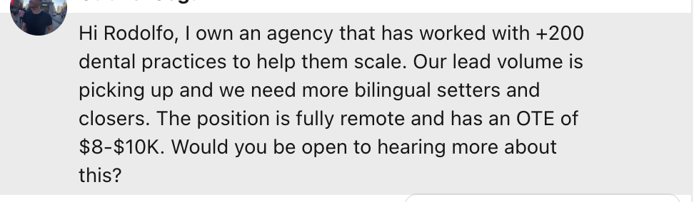 "Necesitamos mas setters y closers Bilingües. La oportunidad es completamente remota y tiene un potencial de ganancias (OTE) de $8-$10k. Estarías abierto a escuchar más?"