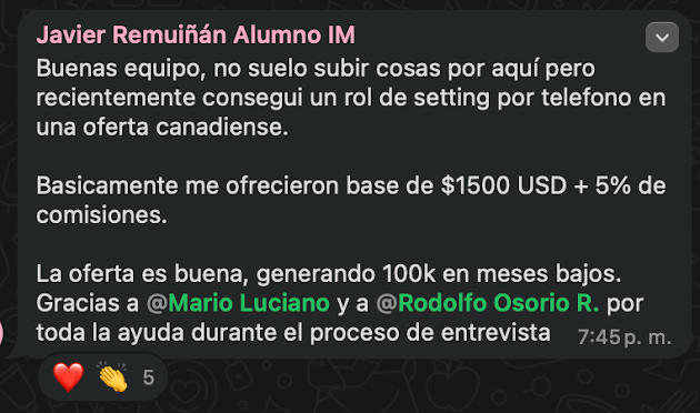 Javier (España) logró encontrar una empresa como Appointment Setter que le ofrece $1500 de Base + 5% de comisión por cada venta. Todo mientras estudia en la universidad.